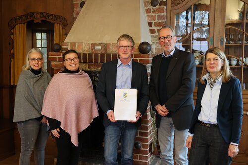 Foto (v.l.n.r.): Peggy Kuwan (Fachbereichsleitung "Soziales", Nadine Tams-Detlefsen (Projektleitung), Andreas Link (Geschäftsführer des Diakonischen Werks im Kirchenkreis SL-FL), Dr. Wolfgang Buschmann (Landrat SL-FL) und Birgit Lunde (Diakoniepastorin und Geschäftsführerin)