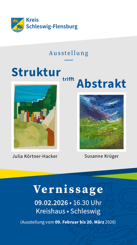 Im Rahmen einer feierlichen Vernissage wird die Ausstellung „Struktur trifft Abstrakt“ im Beisein der Künstlerinnen am 09. Februar um 16:30 Uhr eröffnet und kann dann bis zum 20. März während der Öffnungszeiten im Foyer des Kreishauses besucht werden.